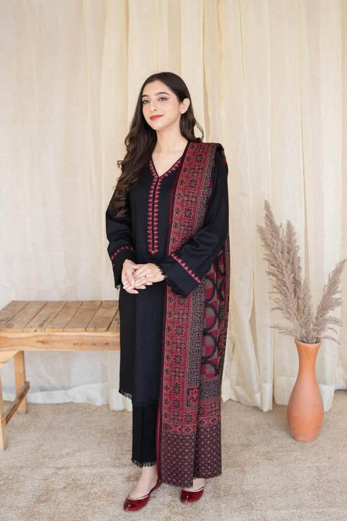 Embroidered dhanak front with neck patch, embroidered sleeves, plain dyed dhanak back